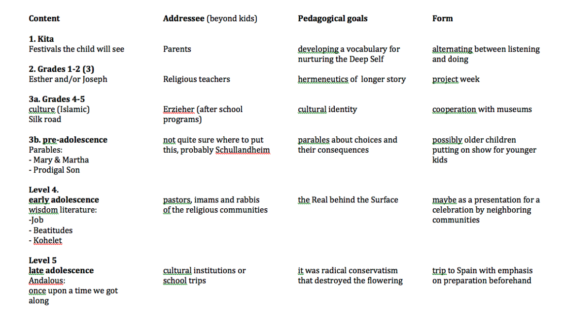 1.-3. Klasse: Erwerb von Schlüsselkompetenzen (Englisch = 3 R’s => reading, writing and arithmatic)[Lesen, Schreiben und Mathe]). Ist in der Kita das Bilderbuch und die erste Schritte, das „Lesen“ von Bildern und die Erfassung einer zusammenhängende Geschichte im Vordergrund, so ist hier die Hermeneutik einer längeren Geschichte angepeilt. Das braucht auch Zeit. Wird in der Kita in einer übergeordneten Hermeneutik (Bezug der Geschichte zu dem Fest, zu dessen Werte und dem Bezug zum Leben in der Gemeinschaft) eingeführt, so wird hier die Geschichte im Vergleich zu parallelen ähnlichen Geschichten (Joseph) oder zu historische Perspektiven (z.B. Rolle der Frau und/oder Umgang mit Macht in der Politik) betrachtet. Es genügt, einen Hauch davon, dass die Kinder das erweiterte Horizont erahnen, in dem sie nun hineinwachsen werden.